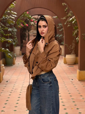 The design features a double-layer back flap, a zipper-adjustable hood, and statement shoulder details, giving you both functionality and a fashion-forward edge. Lightweight, breathable, and perfect for unpredictable weather — this piece brings together practicality and elevated street style.