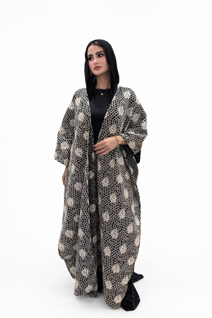 A Ramadan kaftan with rich crinkle velvet from the back and delicate embroidered detailing at the front for an elegant, flowing look.